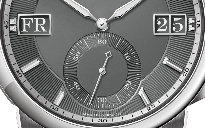 De grijze wijzerplaat van de witgouden A. Lange & Söhne Odysseus is anders gedecoreerd dan de stalen primeur De grijze wijzerplaat van de witgouden A. Lange & Söhne Odysseus is anders gedecoreerd dan de stalen primeur